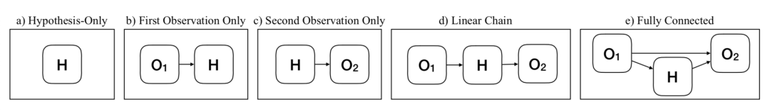 论文为αNLI制定了一套概率模型,这些模型对上述的公式进行了各种独立性假设,从一个完全忽略观测值的简单基线开始,然后建立一个完全联合的模型。这些模型在图2中被描述为贝叶斯网络。从理论上讲,“完全连接”模型可以将来自两个可用观测值的信息进行组合。