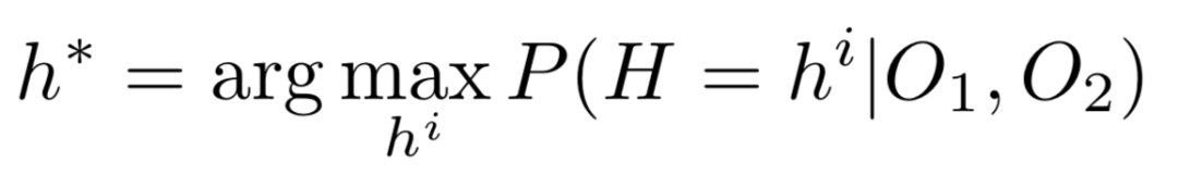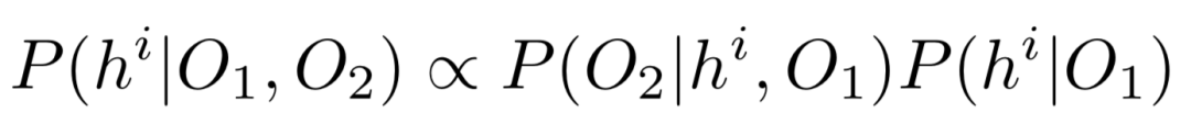 线性链:下一个模型同时使用两个观察值,但会独立考虑每个观察值对假设的影响,即它不会合并各个观察值的信息。形式上该模型假设三个变量<O1,H,O2>形成线性马尔可夫链,其中第二个观测值在给定假设下(即 (O1 ⊥ O2|H))有条件地独立于第一个观测值。在这种假设下,目标是使公式2稍微简单些(公式3):