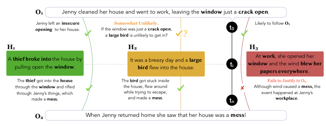归纳(归因)自然语言生成:αNLG是在给出两个观测值 O1 和 O2 的情况下生成有效假设 h^+ 的任务,形式上该任务需要最大化 P(h+ | O1, O2 )。
