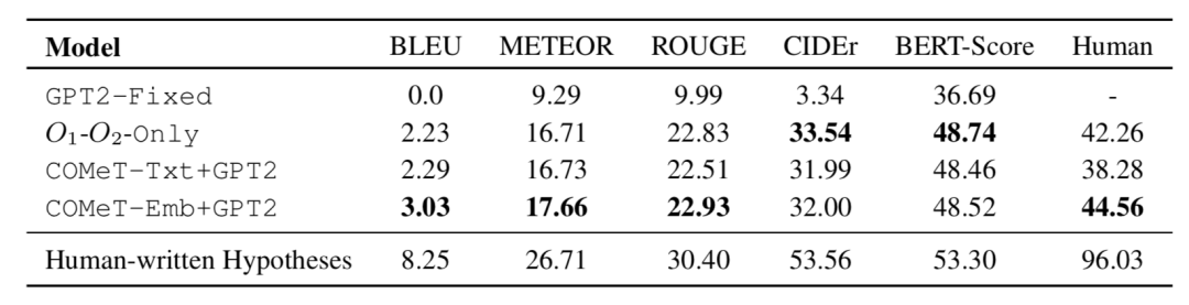 表2 生成模型在ART测试集上的性能。除GPT2-Fixed外,所有型号均在ART上进行了微调。