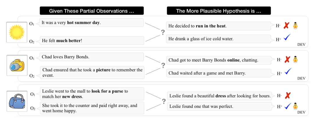 给定观察结果和一对假设,αNLI的任务是选择最合理的解释(假设)。