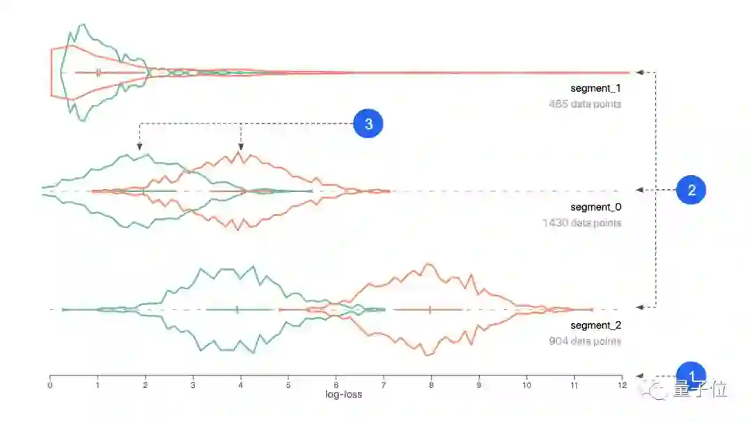 X轴是模型的性能指标,一般是对数损失、平方误差或原始预测值。图片会根据实例之间跨模型的性能相似性,将数据集自动分为多个横行。而不同的颜色代表不同的模型。