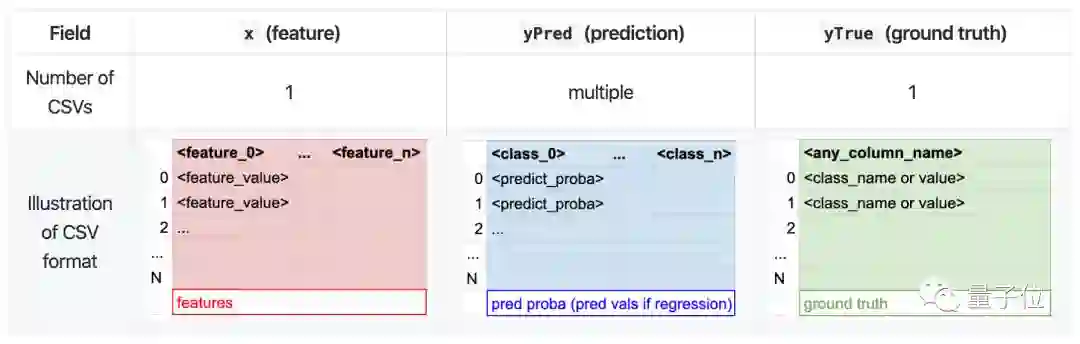 在Demo网站上,我们可以看到三个上传项,它们分别是输入的“特征”、输出的“预测”以及“真实值”,分别对应于x、yPred、yTure,三个部分都以csv文件格式上传。
