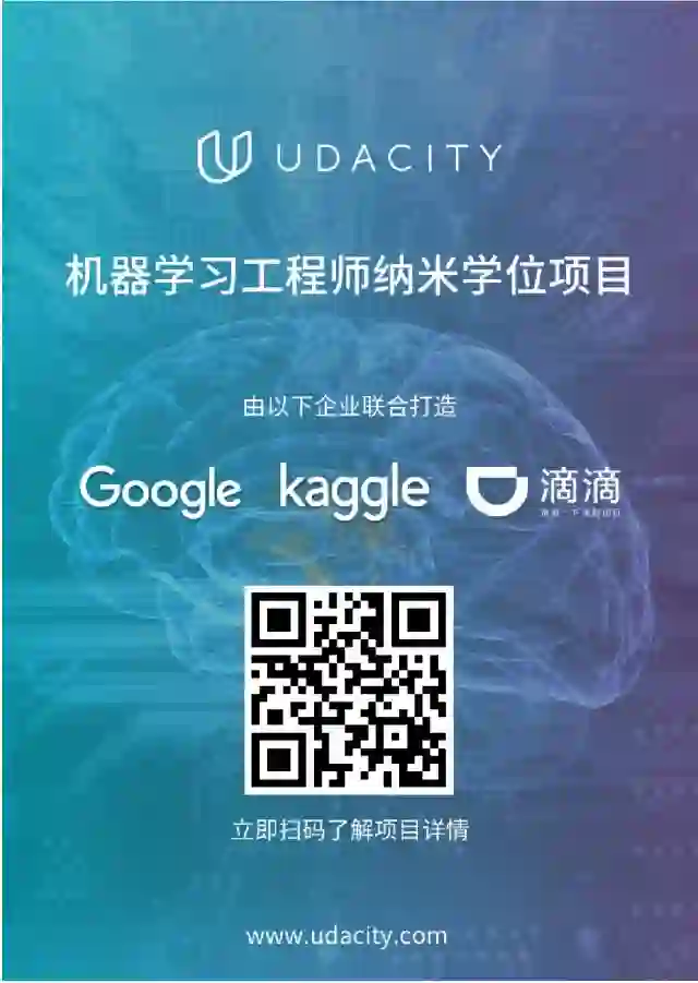 来自硅谷的前沿技术学习平台 Udacity 与 Google 、Kaggle 、滴滴出行 联合推出了“机器学习工程师”纳米学位认证项目,将带你零基础学习硅谷技术课程,全面掌握机器学习所需知识,通过一些列实战项目将预测模型实际应用于金融、医疗、教育等领域,毕业后获得 Google 技术认证证书,成为大数据、人工智能领域的抢手工程师。