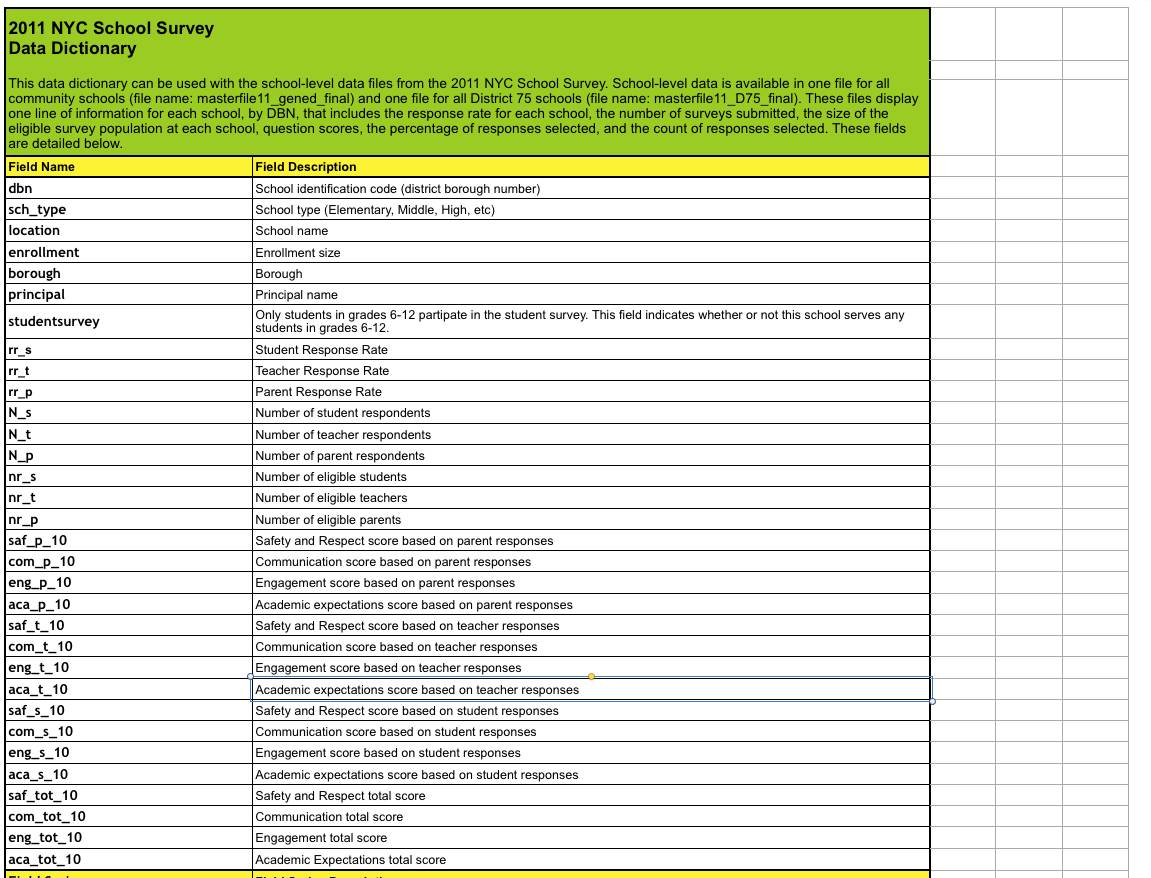 survey_fields = ["DBN", "rr_s", "rr_t", "rr_p", "N_s", "N_t", "N_p", "saf_p_11", "com_p_11", "eng_p_11", "aca_p_11", "saf_t_11", "com_t_11", "eng_t_10", "aca_t_11", "saf_s_11", "com_s_11", "eng_s_11", "aca_s_11", "saf_tot_11", "com_tot_11", "eng_tot_11", "aca_tot_11",]