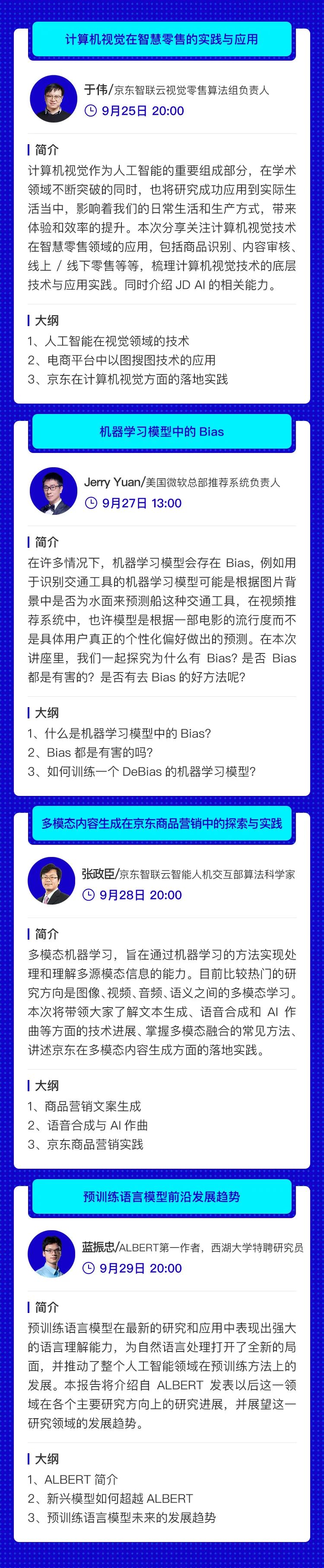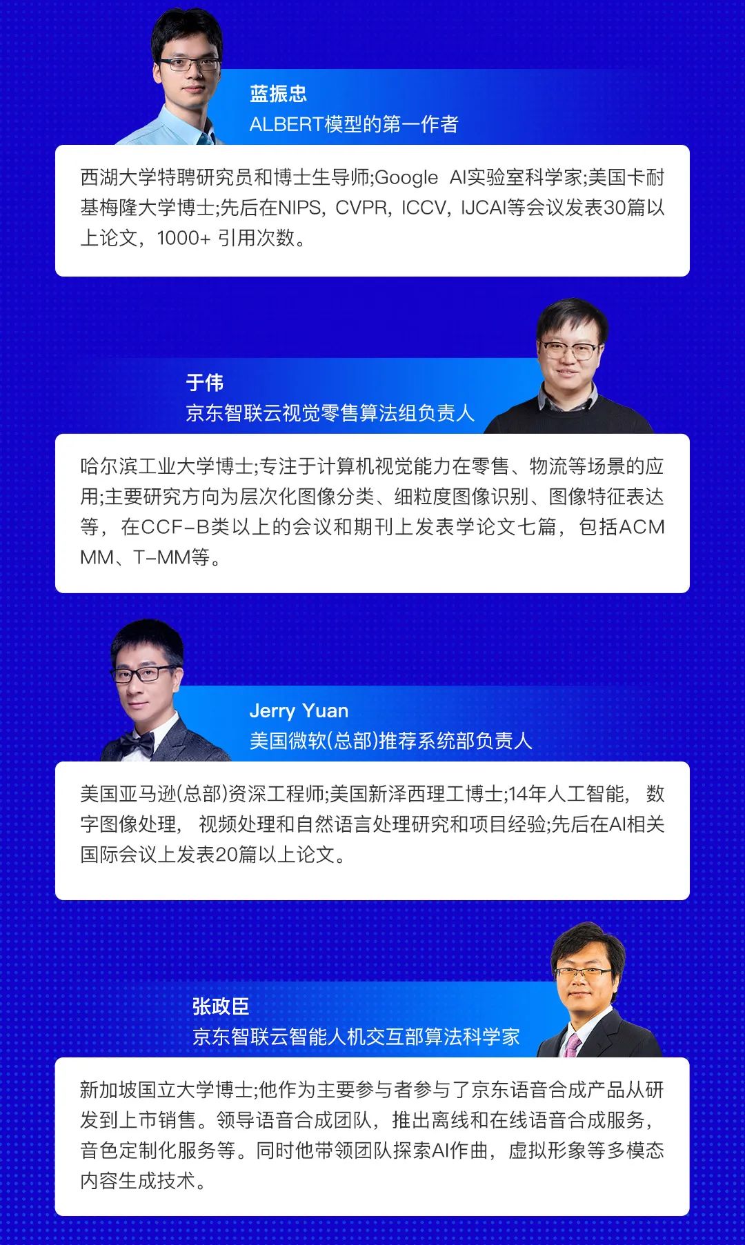 本次线上交流会由贪心科技和京东智联云联合举办,并且有幸邀请到了ALBERT的一作,西湖大学特聘研究员蓝振忠博士来讲述预训练模型的发展;京东智联云视觉零售算法组负责人于伟博士来讲述CV如何应用在智慧零售;微软推荐系统组负责人Jerry博士来讲述机器学习模型中的Bias如何在工程中更好地解决;京东智联云智能人机交互部算法科学家张政臣博士讲述内容生成在商品营销中的实战。
