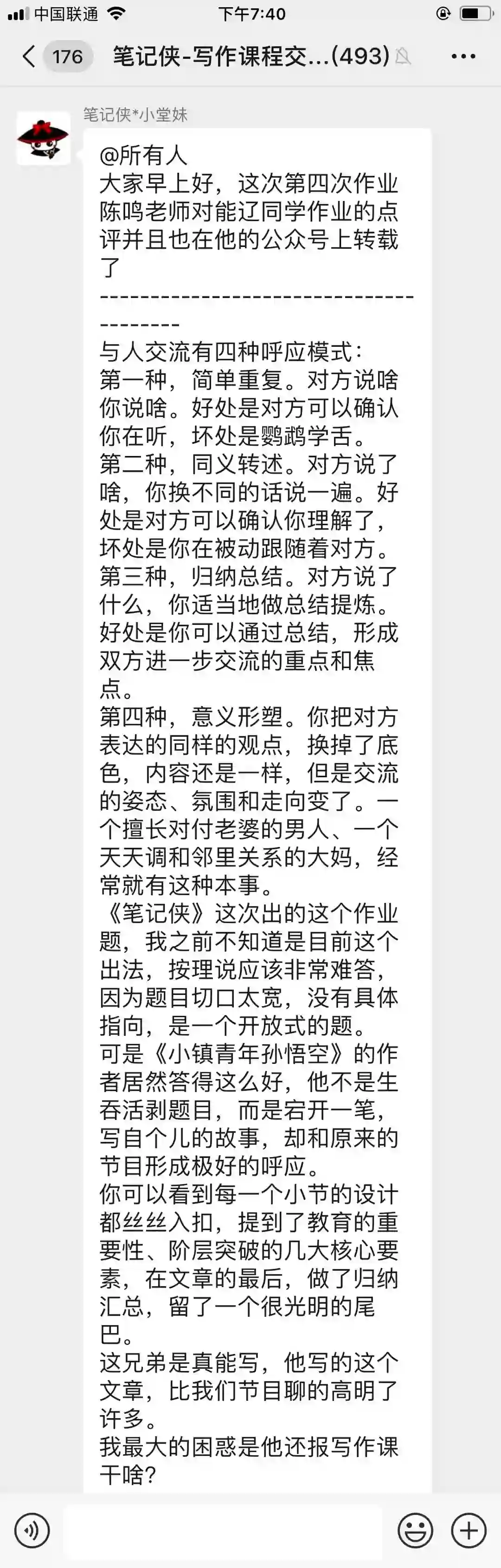 当然,也有极其优秀的学员,他的作业被陈鸣老师这样评价:“我最大的困惑是他还报写作课干啥?”。