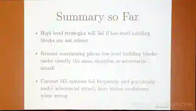 Ian提出的ML安全性对于长期的AI安全至关重要。敌对例子的有效性不仅受当前的ML系统(例如自驾车)的短期视角的影响,还受一些水平不高的参与人的影响。从长远角度来看,调整高级代理的价值也是一个坏消息,由于古德哈特定律,他可能会无意中寻找奖励函数的对抗性例子。因为敌对的例子会干扰代理人的判断,所以依靠代理人对环境或人类偏好的不能确保结果的准确性。