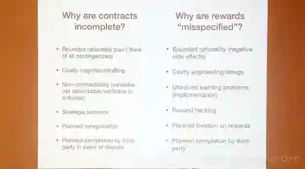 谈话的核心问题是如何利用不完全契约理论的见解来更好地理解和系统地解决AI安全中的规范问题,这是一个非常有趣的研究方向,客观规格问题似乎比不完整的合同问题更难。