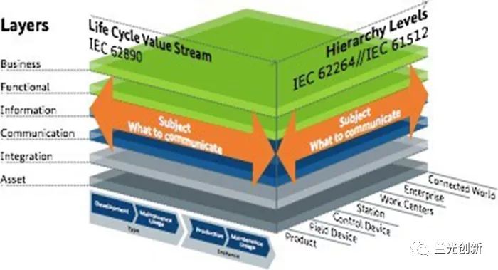 将基于网络通信作为工业4.0必须使用的“科目“,实 际上就是通信的使用。这体现在RAMI4.0的两个维度,即生产组织及其设备按其层级递阶的维度和生命周期和价值流 的维度。正如图1所示,表现为哪些科目需要通信交换数据。