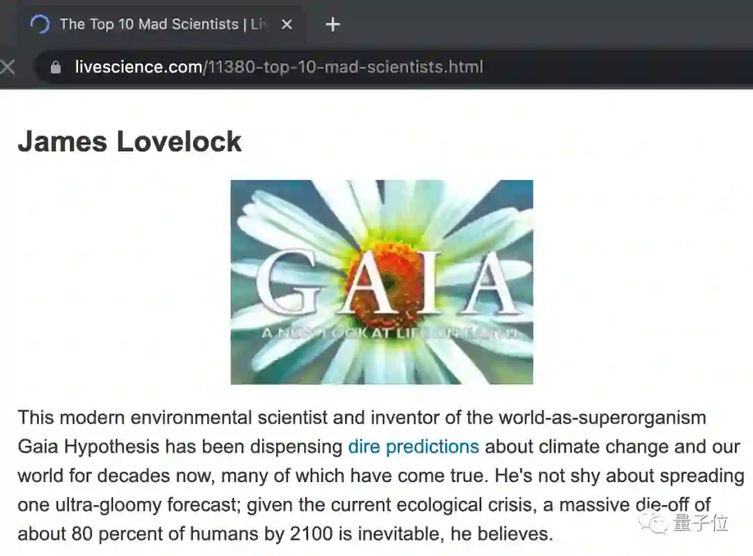 他认为地球是“活”的,把地球比作一个能自我调节的有机体“盖亚”。而由于人类对环境的破坏,这个有机体正在消灭人类。