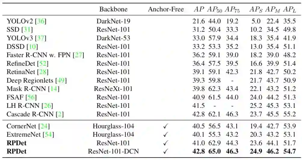 这一 anchor-free 的检测器设计还与同期的一些基于 anchor-free 的检测方法不谋而合,例如 FCOS,FoveaBox,FSAF,CenterNet 等等,他们都发现 anchor-free 方法相比 anchor-based 方法也能取得不错的效果了。