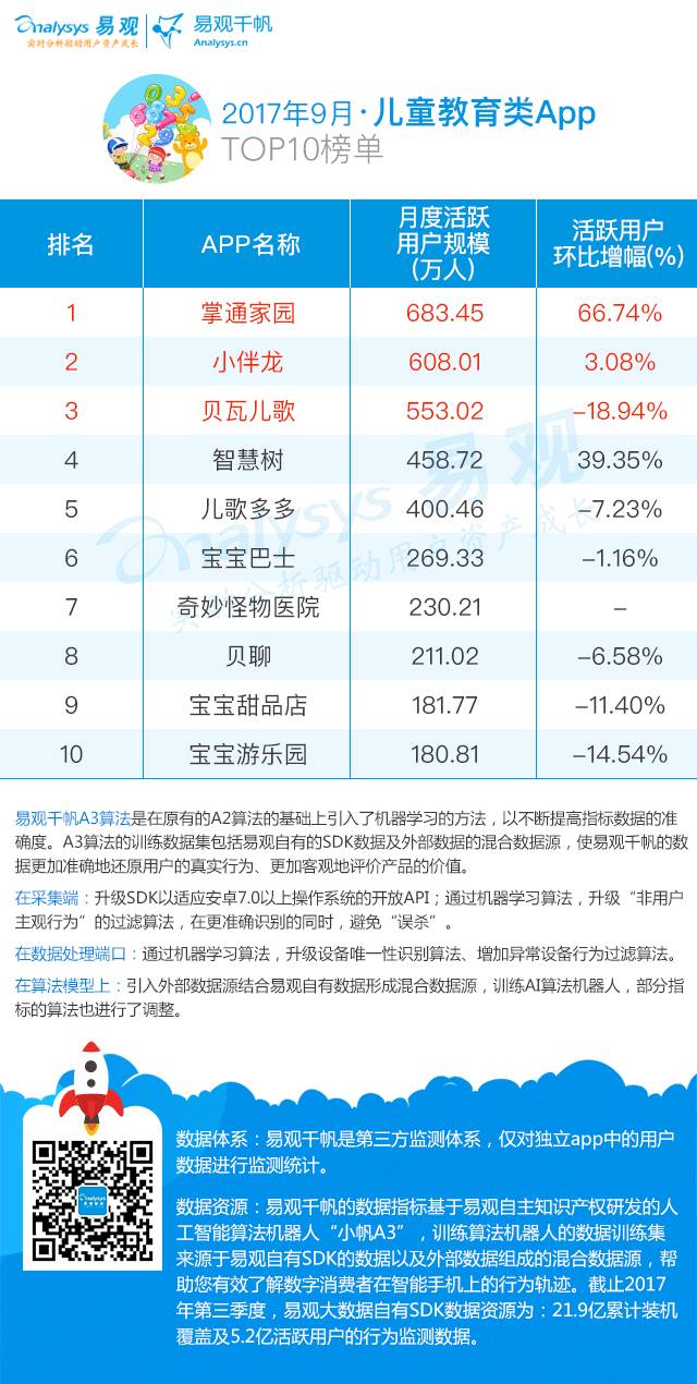 2017年9月,儿童教育类App TOP10榜单中活跃用户环比正向增长的App有3个,开学季后,儿童教育领域月活有所回落,但整体保持稳中求涨态势。