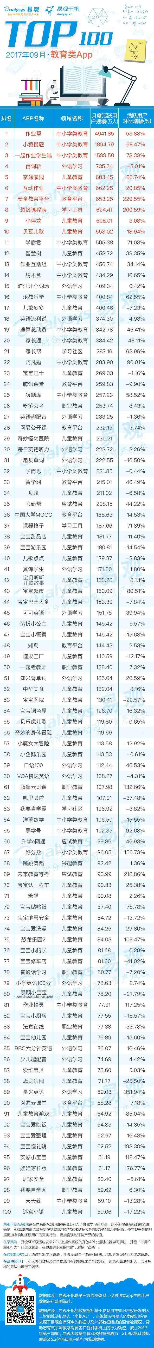 2017最新App TOP1000排行榜 | 教育领域独领风骚 票务市场受票房冲击