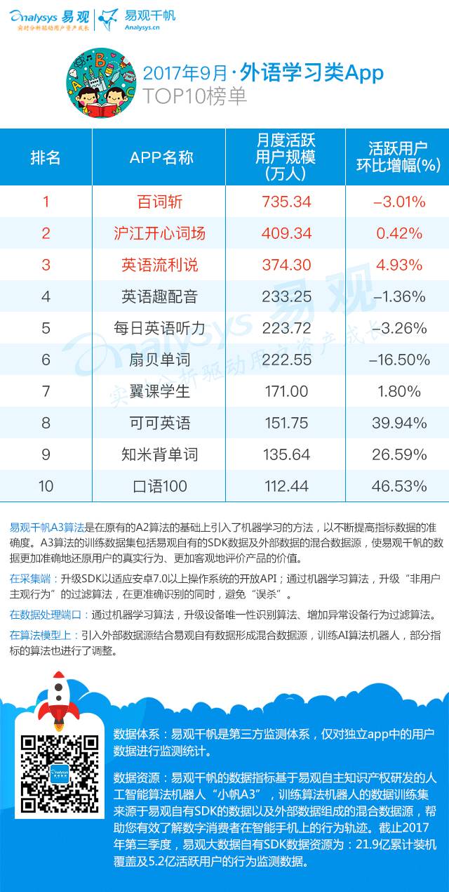 9月榜单中,百词斩以735.34万活跃用户规模位居榜首,月活用户规模有所回落。百词斩在本月中保持自身整体排名,通过其内容和形式优势占据较大的用户粘性。口语100表现不俗,以46.53%的增幅在外语学习TOP10一片低迷之中令人称赞。口语100是主要面向中小学生的英语口语教育应用,给每个学生一个口语陪练,在音节层次上纠正口语发音,并配套各类中小学教材,让孩子的英语教材更灵活。