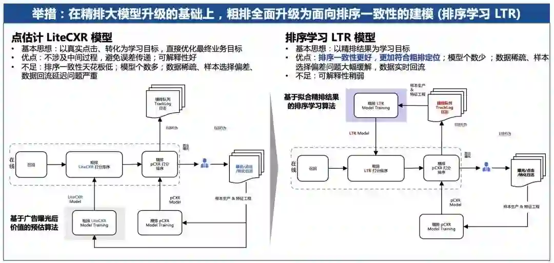 粗排在业界长期以来采用类似精排、但更简单的LiteCXR模型。然而,考虑到粗排的定位是典型的集合选择问题,其核心优化目标应该是排序一致性。所以,研发团队转向排序学习LTR 模型。对比传统做法,LTR模型更加简洁高效,之前数据稀疏、样本选择偏差问题也得到大幅缓解。