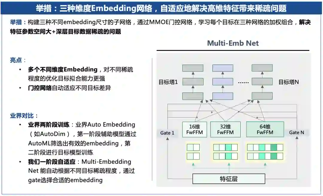 还有行业化,深入行业转化目标多达上百个且数据稀疏,大模型加入大量高维特征,造成样本相对特征参数空间不足。这里腾讯通过提出Multi-Embedding Net,采用多种不同尺寸的嵌入组合学习来减轻这个问题,同时也通过显示匹配(match)特征,降低特征稀疏度。