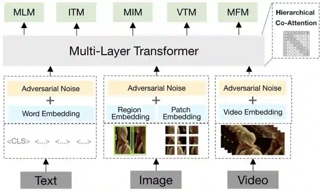 该内容理解模型主要基于Transformer结构,并根据真实业务场景与广告数据特性,提出多尺度视觉特征融合、层次化注意力交互、大规模对抗训练等诸多改进和设计。