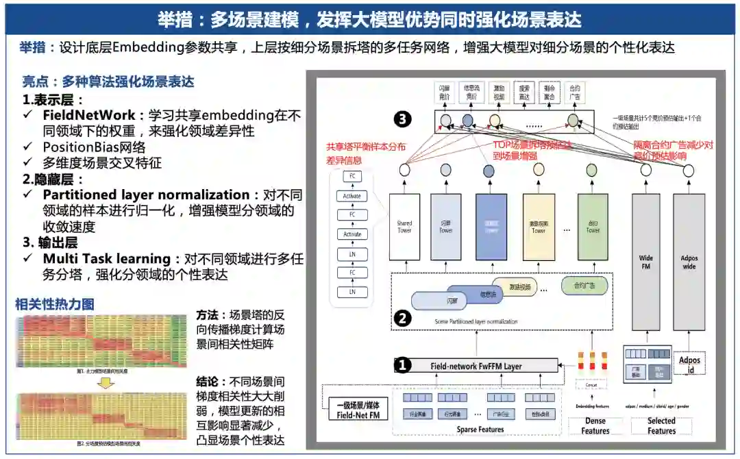 场景化说的是,对于腾讯上万的广告位,场景差异特别大。小模型只能引入场景特征,或者分场景建模,这样效果既达不到最好,维护起来也困难重重。而广告大模型,通过构建场景化模型,集成了多个算法特性组合,从而解决多场景联合建模问题。