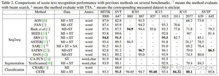 我们的classification-based模型即CSTR,在六个常用的公开数据集上的效果如下表所示。我们的模型没有STN模块,仅仅只有一个图像分类器,训练数据集为常用的两个合成的数据集SynthText (ST)和MJSynth (MJ),仅使用单词级别的标注,测试的时候没用任何TTA,整体效果基本达到SOTA。