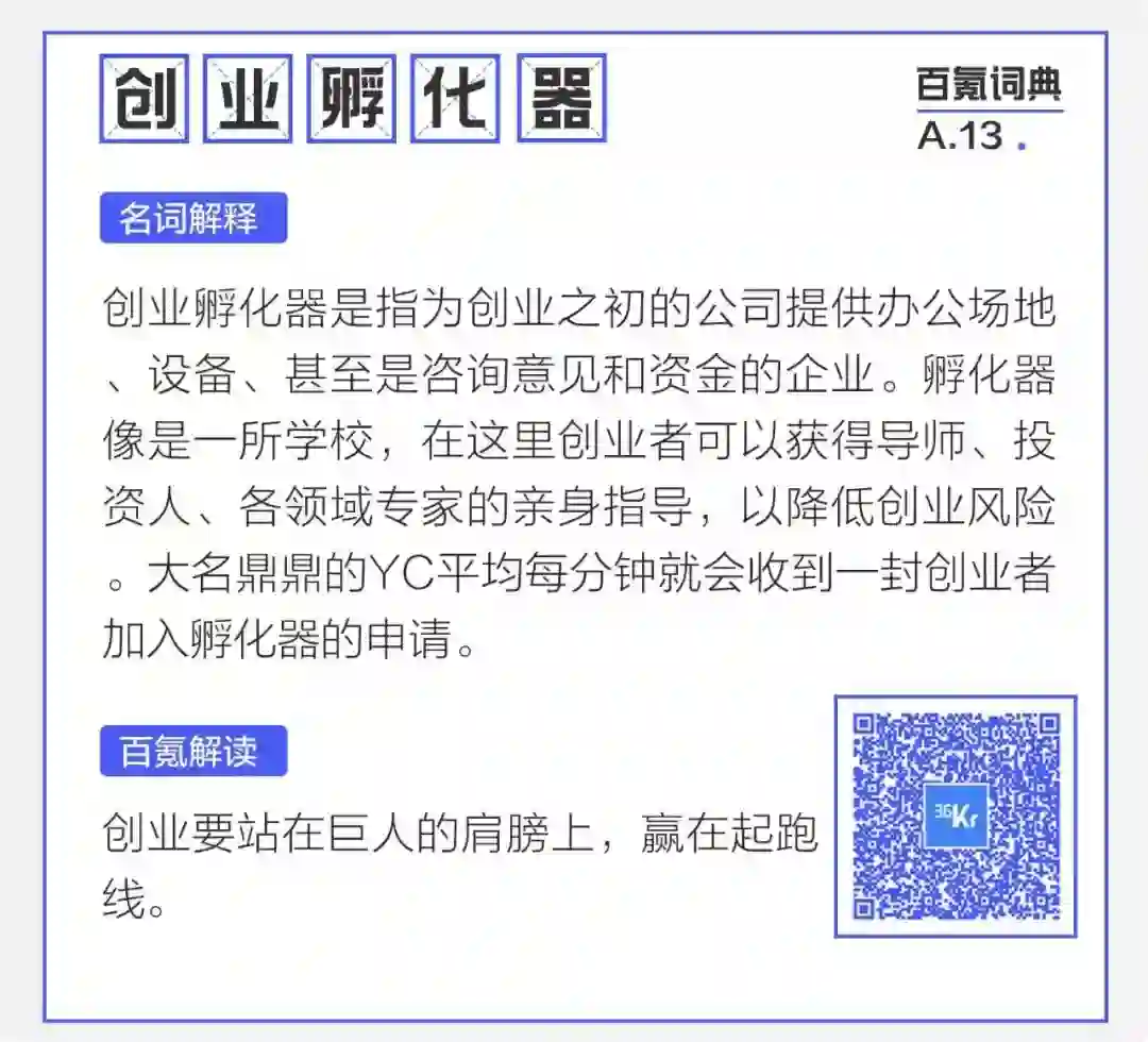 36氪「百氪词典」正式上线,用易懂的方式解读常用的互联网专业术语,丰富你的知识储备。今日解释词为「创业孵化器」,上期词语为「独角兽」。识别图中二维码,获取往期百氪词语,收获更多知识。