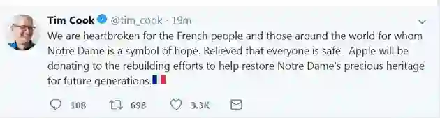 据外媒报道,苹果CEO蒂姆·库克在Twitter上发布推文称,苹果将通过捐款来帮助重建巴黎圣母院。库克表示,“我们为法国人民和全世界人民感到心碎。对于我们所有人来说,巴黎圣母院代表了希望。令人感到欣慰的是,每个人都很安全。苹果将捐款支持重建计划,帮助恢复巴黎圣母院的珍贵的文化遗产,并留给后人瞻仰。”(腾讯科技)