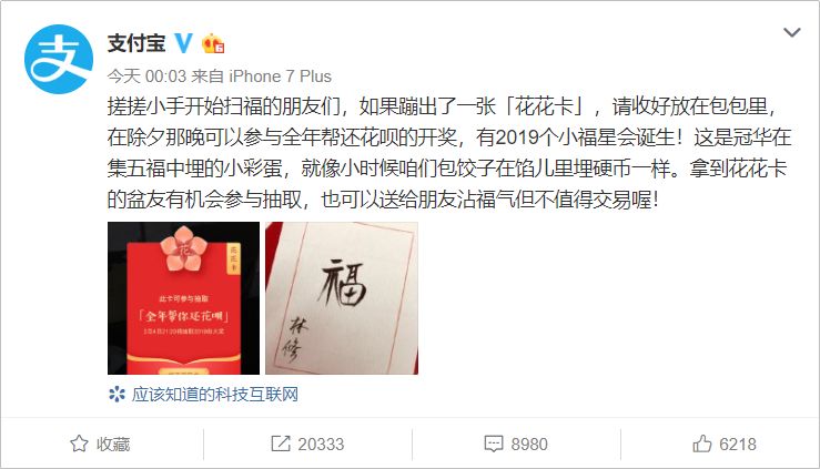 扫五福的时候,会随机蹦出来这个花花卡。有了这个卡,就可以参与抽奖啦!据说除夕当晚会从有花花卡的人里面选 2019 个幸运儿,支付宝可以免费帮还一年的花呗!
