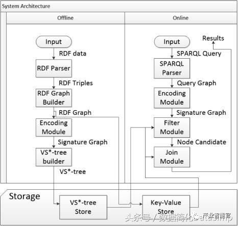 我们在文献[18]中提出一种利用子图匹配方法来回答SPARQL的方法,并构建了相关开源系统gStore。图15给出了系统架构图。在导入RDF知识图谱数据和构建索引阶段,首先将用户输入RDF的三元组文件表示成一张图G,通过链接列表的方式直接存储图G本身。为了加快子图匹配查询的速度,通过编码的方法,将RDF图G中的每个实体节点和它的邻居属性和属性值编码成一个带有Bitstring的节点,从而得到一张标签图G*。我们提出了一种面向G*图的VS-tree的索引结构,可以有效地支持在线查询的阶段的搜索空间过滤。在查询阶段,将用户的SPARQL查询转换为子图匹配查询,利用子图匹配查询的结果来回答用户的问题。图16展示了在3-5亿规模的三元组的国际标准测试集(LUBM和WatDiv)上,gStore系统和目前使用最为广泛的RDF知识图谱存储查询系统Virtuoso和Apache Jena之间的查询性能对比情况。由于基于图结构方法的索引可以考虑到查询图整体信息,因此总的来说查询图越复杂(例如查询图的边越多),gStore相对于对比系统的性能会更好,有的可以达到一个数量级以上的性能优势。gStore的分布式版本的在10台机器组成的Cluster上可以进行50-100亿规模的RDF知识图谱管理的任务。