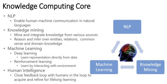 所以说真正要进入到AI时代,机器必须要有语义的理解,而且要知道为什么用这个东西来代表某个事情。我们微软知识计算组的任务就是,我们怎么能够为这个世界服务,通过什么手段让机器可以自动理解知识,通过对数据的挖掘来增进我们的知识。我们希望机器以后能帮人们干更多的活。