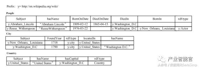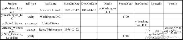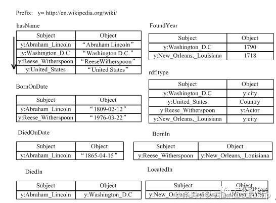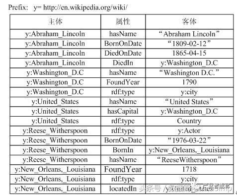 下图1展示了一个人物类百科的RDF三元组的知识图谱数据集。例如y:Abraham_Lincoln表示一个实体URI(其中y表示前缀http://en.wikipedia.org/wiki/),其有3三个属性(hasName,BornOndate,DiedOnDate)和一个关系(DiedIn)。
