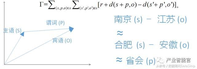 近几年来,机器学习领域也掀起了对知识图谱的研究,热门的课题包括面向知识图谱的“表示学习”,其中最为代表性的研究工作是TransE模型[26]。给定一个知识图谱,我们将知识图谱三元组中的每个主语、宾语和谓词都映射成一个高维向量,其优化目标可以表示为最小化图17中的公式。这个公式的基本含义是,对于存在于知识图谱G里面的任何一条三元组,其中主语,谓词和宾语的向量表示结果为s, p 和o, 我们要求主语(s)和谓词(p)的向量和(SUM)离宾语(o)的向量表示尽量的近;对于不存在知识图谱G中的三元组,则相互距离尽量的远。图17可视化了TransE模型的含义,基本含义是谓词相同的两个三元组,它们分别的主语与宾语的向量差是近似的。在TransE模型的基础上,学术界提出了很多改进的知识图谱Embedding的方案。这些模型在很多任务,例如知识图谱的谓词预测,知识补全等方面比以前的方法在准确度都有不小的提升。
