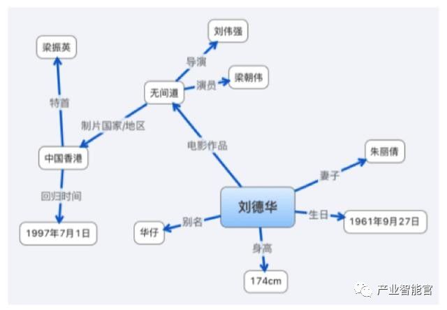 知识图谱又可以从数据角度和技术角度来看。以数据方面为例,它就是一个语义的知识库,里面的组成单位是“实体—属性—关系”这样的三元组,各个组聚合在一起 就构成了复杂的网状知识结构。比如“刘德华”周围有很多关系:他的别名、身高、生日、妻子以及电影作品,他演的《无间道》又包含了相关的导演、演员以及制 片地区香港等。所以知识图谱能非常直观的表达对象与对象之间的关系。世间万物是一个错综复杂的关系网,但是无论形式上多么复杂,其实本质上都是简单的三元 组。
