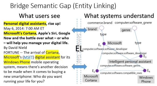 所以,机器跟人之间的沟通或者是机器要去了解这个世界的时候,它有一个语义的鸿沟。我们还有个技术叫实体链接,比如文章里有“微软的Cortana”,这个短语里包括了两个实体,一个是微软,一个是Cortana。以前在做自然语言处理的时候,我们说这是一个名词词组,不需要了解里面讲的是微软还是什么,它就是个专有名词,Cortana也是一个专有名词。但人理解的时候,我们不是只知道它是什么词性的,我们知道微软是代表一个公司,Cortana是微软公司的一个产品。