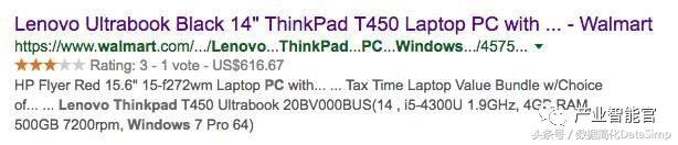 下面介绍Google另外一个利用知识图谱的项目叫“Google Rich Snippets”(Google富摘要)。搜索引擎在搜索结果的页面中会为每一篇搜索结果提供一个目标网页的摘要,以便用户判断是否是自己想搜索的页面。通常网页的摘要是采用“抽取式”方式生成的,即从网页的页面文本中找到和搜索关键词相关的并且比较重要的句子来构成页面的摘要返回给用户。但是Google的富摘要产品中,会抽取在用户HTML页面中以结构化形式存在的知识图谱数据,例如描述实体的属性的数据。目前这方面的标准有包括RDFa, Microdata和Schema.org等结构化数据标签。假设用户想在搜索“Thinkpad T450”产品,在Google返回的Walmart(沃尔玛)线上商店的页面摘要(如图7所示)中,摘要中包含了这个产品的打分(Rating 3星),评论数目(Vote 1份评论)和商品的价格(616.67 美金)。实际上这些重要的数据,用户已经通过Schema.org等结构化的语义标签在HTML中标示出来了,搜索引擎可以通过解析器(Parser)解析出这些结构化数据,利用这些结构化知识图谱数据来产生摘要。我们在图6中展示了利用Google的结构化测试工具,可以从上述沃尔玛产品页面的HTML中抽取上面提到的商品的价格和商标等属性信息。
