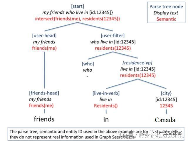 Facebook也定义了一种类似的标签语言,名叫Open Graph Protocol(OGP)。Facebook利用OGP协议定义了社交网络中上的知识图谱,即Facebook Social Graph,用于连接社交网络的用户,用户分享的照片,电影,评论,甚至包括通过Facebook定义的Graph API所链接的第三方的关于社交用户知识图谱数据。在所构建的Social Graph基础上,Facebook推出了Graph Search(图搜索)功能。将用户的自然语言问题,转化为面向Social Graph上的图搜索问题,从而回答用户的问题。假设以我的Facebook账号登录,输入自然语言“My friends who live in Canada”,将显示了我在加拿大的朋友的账号;同样地,再输入“Photos of my friends who live in Canada”,显示这些朋友的在Facebook上分享的照片。从这个例子上可以很明确的看出,Facebook所构建的Social Graph将用户、地点以及照片都关联起来,否则无法回答上述两个自然语言问题。Facebook将用户的输入的自然语言转化为面向Social Graph的结构化查询操作。从图8中可以看出,原始查询语句在经过自然语言接口模块处理后,对应的规范化自然语言查询语句和结构化查询语句分别为:“my friends who live in [id:12345]”和“intersect(friends(me), residents(12345))”[31]。其中,“12345”代表“Canada”在社交图谱上对应的Facebook ID。对应的结构化查询语句会交给Facebook内部设计的面向社交图谱的索引和搜索系统Unicorn[2],最后查询得到答案。