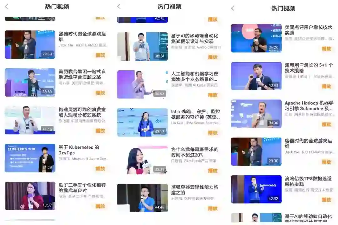 我初步盘算了一下,目前应该已经有1000+视频,累计400+资深专家的主题分享。包含了BAT、Google、Facebook、LinkedIn、Twitter、Netflix、Uber、Spotify、今日头条、京东、网易、美团等国内外顶尖大厂的最新实践经验,并且涵盖人工智能、大数据、云计算、架构、运维、移动、前端、编程语言、管理、产品等当前各个热门领域的最新研究进展以及业界顶尖技术。