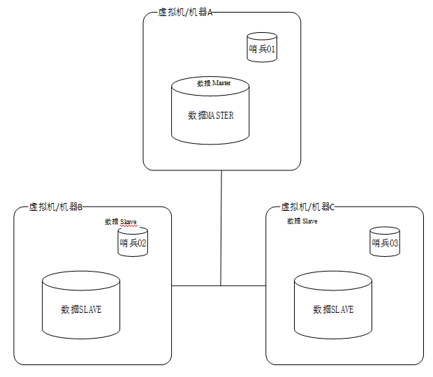 这里给出一个哨兵的通用部署方案。哨兵节点一般至少要部署3份,可以和被监控的节点放在一个虚拟机中,常见的哨兵部署如图所示。