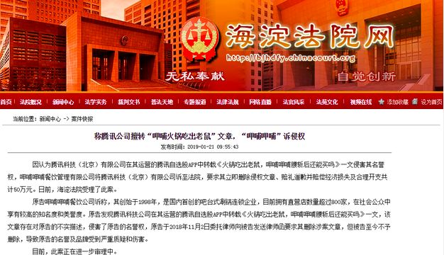 1月21日消息,据海淀法院网,因认为腾讯科技有限公司在其运营的腾讯自选股App中转载《火锅吃出老鼠,呷哺呷哺腰斩后还能买吗》一文侵害其名誉权,呷哺呷哺餐饮管理有限公司将腾讯科技诉至法院,要求其立即删除侵权文章、赔礼道歉并赔偿经济损失及合理开支共计50万元。日前,海淀法院受理了此案。