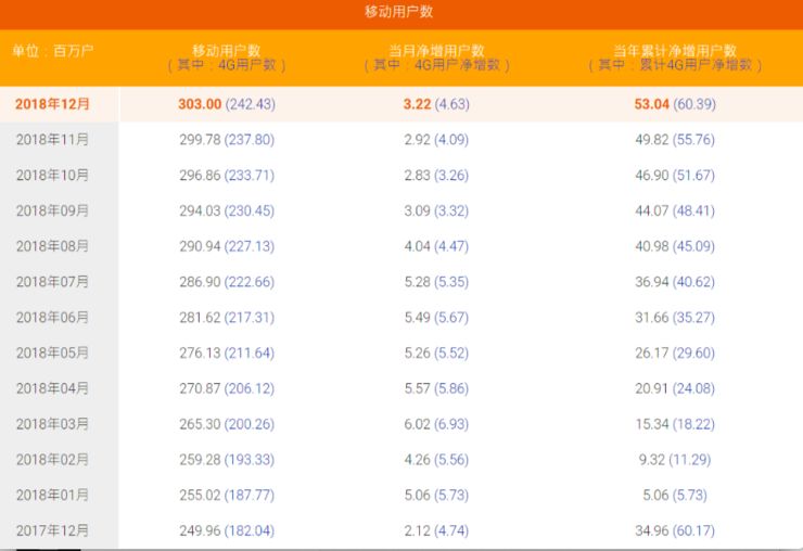 继移动、联通之后,中国电信也公布了 2018 年 12 月的主要运营数据。其中,移动用户数首次突破 3 亿大关,达到 3.03 亿户,其中 4G 用户数 2.4243 亿户,当月净增 4G 用户数 463 万户。有线宽带业务方面,截至 2018 年 12 月底,中国电信有线宽带用户数达 1.4579 亿户,当月净增用户数 55 万户,当年累计净增 122.6 万户。