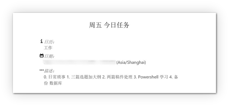 早上 7 点,起床洗漱的我看到手机提示收到了一封邮件,点开一看,是一封来自「自己」的日程邮件,大致列出了今天一天要做的各种任务: