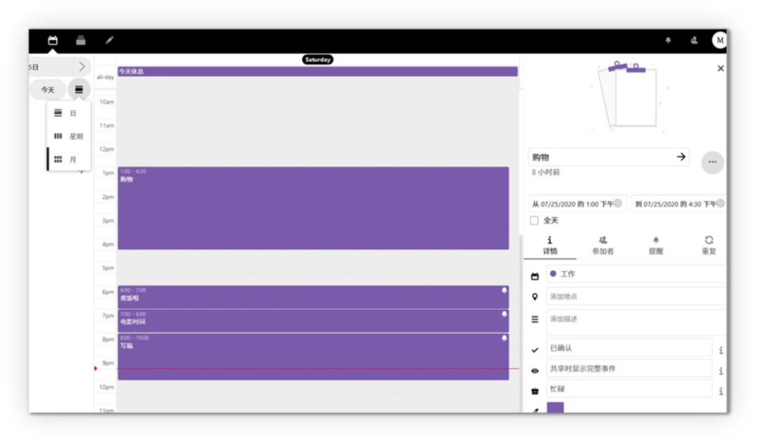 日历编辑体验还不错,支持设置提醒、重复,也能用邮件邀请别人参与。事件以色块的形式展示,可以拖动,缩放来控制时长和开始时间。Nextcloud 提供了「电子邮件服务器」选项,登入支持 SMTP 协议的邮件,Nextcloud 就能用此邮件发送各种提醒。
