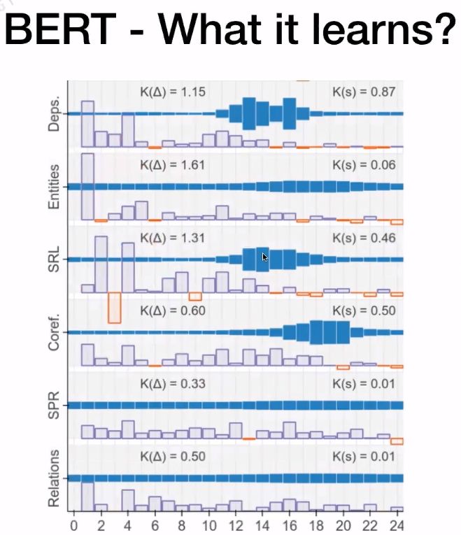 从上图可知,蓝色部分越长表示改层Transformer对该NLP任务所起的作用更大。在Coref.任务中,可以看到18、19、20层所起的作用更大。