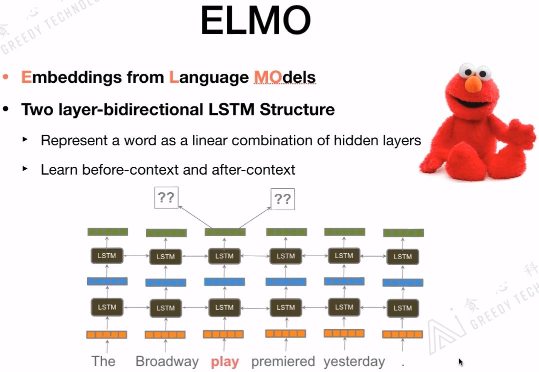 ELMo用的是long contexts信息,而不是其他模型用到的window size contexts信息。ELMo用到的是Bi-LSTM,如果ELMo换成Transformer那就和BERT结构基本一样了。