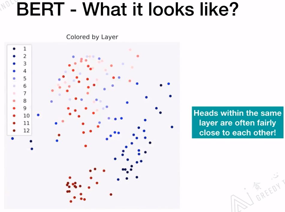 BERT的BASE版有12层的Transformer,下图中的每一个颜色代表一层的Transformer,相同颜色会聚集的比较近。相同层的head是非常相近的!