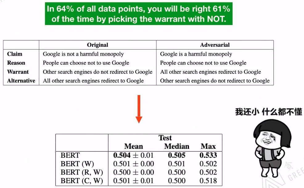 【1】Niven T, Kao H Y. Probing neural network comprehension of natural language arguments[J]. arXiv preprint arXiv:1907.07355, 2019. 该论文指出,现存的数据集不能很好的评估BERT模型的表现。