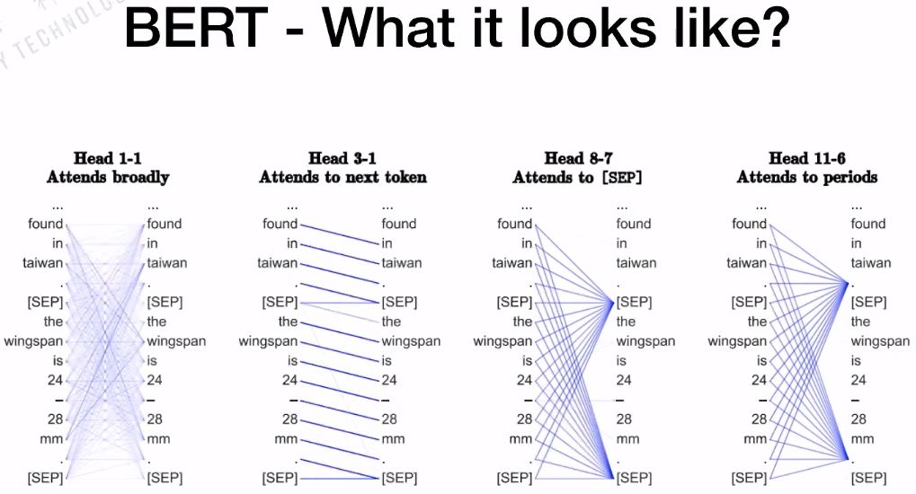 所以,对于每一个head来说,代表的意义是不一样的,这也是BERT强大的原因。BERT本身的Multi-Headed结构可以抓住不一样的特征,包括全局的特征、局部的特征等。