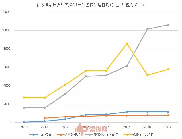 在这里,雷锋网也整理了 Intel 核芯显卡、 AMD 核显 & 独显以及 Nvidia 独显之间的同期最强图像处理性能,对比如下图所示: