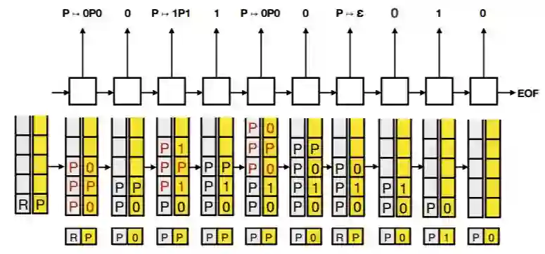 图 3:左图:序列「010010」的解析树。右图:用于生成左图所示的解析树的动作序列。实线箭头表示动作流的时间顺序,虚线肩头表示上一层嵌入的输入(参见第三章-B)