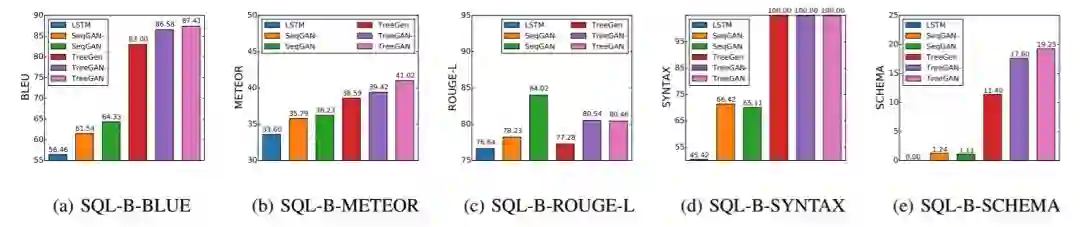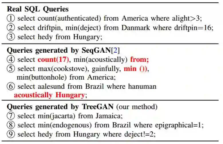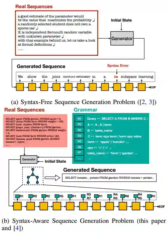 受到其在图像生成和相关领域取得的巨大成功的启发,GAN[1] 最近已经被扩展到序列生成任务中 [2,3]。用于序列生成的 GAN 在现实世界中有许多重要的应用。例如,为了给一个数据库构建一个良好的查询优化器,研究人员可能希望生成大量高质量的合成 SQL 查询语句对优化器进行基准对比测试。不同于图像生成任务,大多数语言都有其固有的语法或句法。现有的用于序列生成的 GAN 模型 [2,3,7] 主要着眼于如图 1a 所示的句法无关(grammar-free)的环境。这些方法试图从数据中学习到复杂的底层句法和语法模式,这通常是非常具有挑战性的,需要大量的真实数据样本才能取得不错的性能。在许多形式语言中,语法规则或句法(例如,SQL 句法,Python PL 句法)是预定义好的。将这样的句法引入到 GAN 的训练中,应该会得出一个具有句法意识的更好的序列生成器,并且在训练阶段显著缩小搜索空间。有句法意识的现有序列生成模型 [4] 主要是通过极大似然估计(MLE)进行训练的,它们高度依赖于真实数据样本的质量和数量。一些研究 [2,5] 表明,对抗性训练可以进一步提高基于极大似然估计的序列生成性能。即使有句法意识的现有序列生成方法引入了语法信息,其生成结果也可能不是最好的。