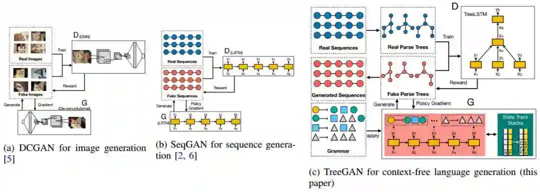 生成对抗网络(GAN)在图像生成领域表现出了很强的能力。最近,GAN 从图像生成领域扩展到了序列生成领域。用于序列生成的现有 GAN 主要关注的是一些语法无关的一般序列。然而,在许多实际应用程序中,我们需要生成一种形式语言的序列,并受相应语法的约束。生成这样的序列非常具有挑战性。为了解决这些问题,本文研究了通过 GAN 实现的有句法意识的序列生成问题,提出了一个新的 GAN 框架——TreeGAN,将给定的上下文无关文法(CFG)融入序列生成过程中。本文证明了 TreeGAN 可以为任何 CFG 生成序列,它的生成完全符合给定的句法。在合成和真实数据集上的实验表明,TreeGAN 显著提高了上下文无关语言中序列生成的质量。